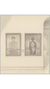 どちらにも登場する“山高帽の男”たちが、まるで静かに対話を交わしているように見えてきます。